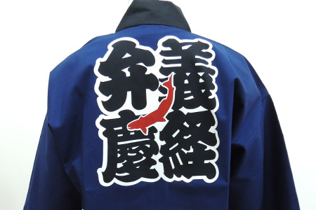 当店ではお客様にてご準備いただいたオリジナルのロゴや書体、写真やフルカラーのイラストを半纏・法被にデザインすることが可能です。ご希望の方は当店までデータをお送りください。
